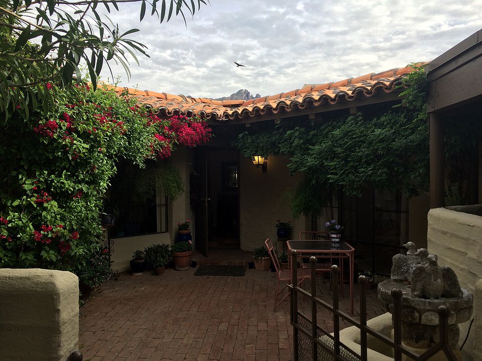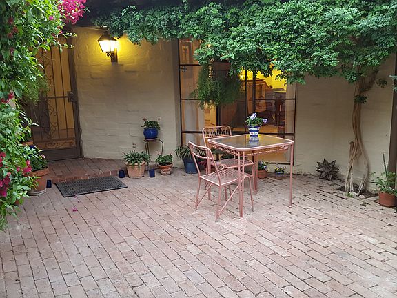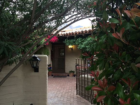 Located in a small historic neighborhood on 5.5 acres, these homes were built Juan Worner Baz, the successor of Josias Joseler. The home features a courtyard entry with a fountain, & mountain views in a tranquil setting. It is a an example of Baz's creative use of space and angles.Saltillo tile floors, lots of storage, wood fireplace & original charm. Floor to ceiling windows frame the views.Feels like a town home but organized as a Condo complex where everything is covered such as roof,exterior paint, water, roads,fire insurance,common areas. Property taxes will be much lower in the future as owner has received historic status. Gas and Electric bills are low. Community features a pool,koi pond, walk-ways,lush landscaping & a laundry facility.