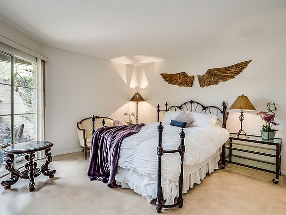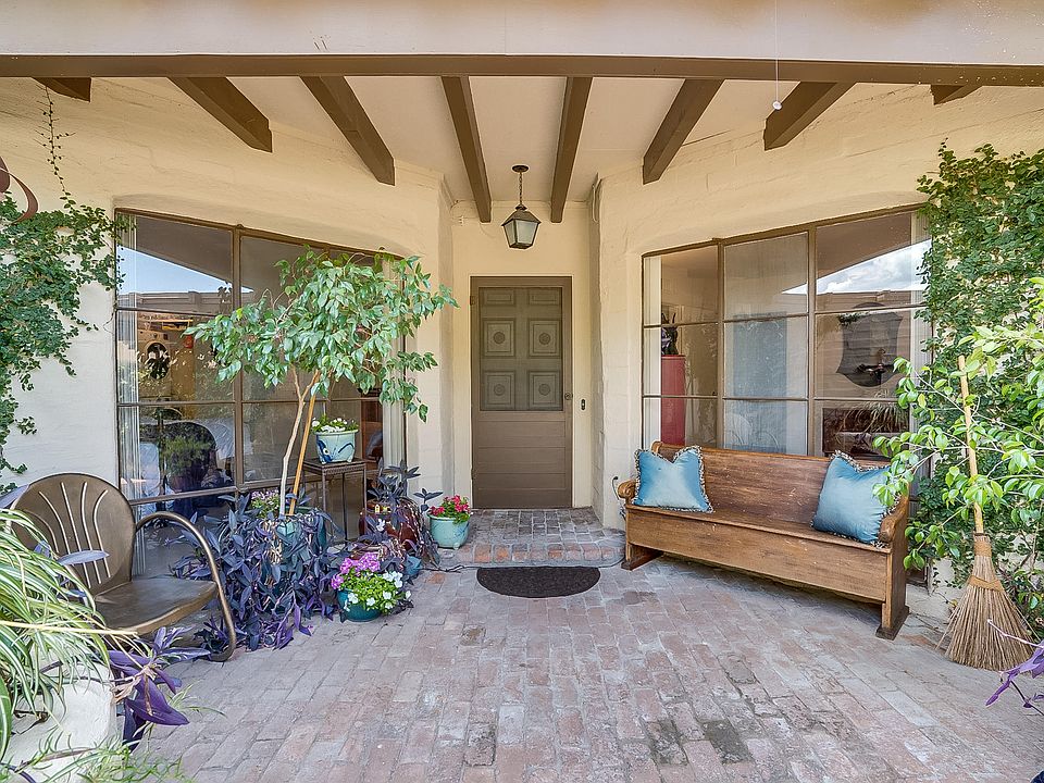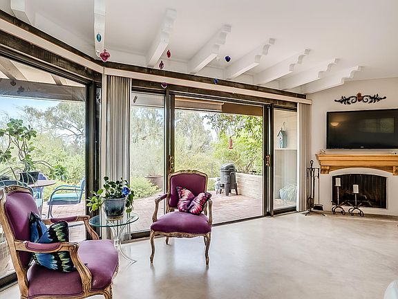 Quintessential Funky Tucson! Unique and Charming, ground floor unit with 2 master suites. Every room looks outside! Entire south wall is windows that gives onto a gorgeous mature viewshed of a stand of Tall eucalyptus trees. A bird watchers delight! Storage galore with built in cabinets in every room. Hand painted continuous concrete floors adorn this sought after this Historic Property designed by Juan Worner Bas: renowned Mexican Architect/Artist, successor of Josias Joesler. Every room is heptagonal or trapezoidal to keep the energy moving! Serenity abounds with this rich cultural , spa-like community pool with fountains, koi pond and walking paths meander throughout this property. 1 covered parking at unit additional parking and storage on site. 1 of only 24 units, Fabulous location Campbell/ Skyline: across the street from La Encantada with galleries, restaurants and shopping! Passive Solar Home. HOA includes: water, roof, exterior maintenance (including pest, grounds, pool, streets), garbage, structural insurance, Fire protection.