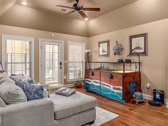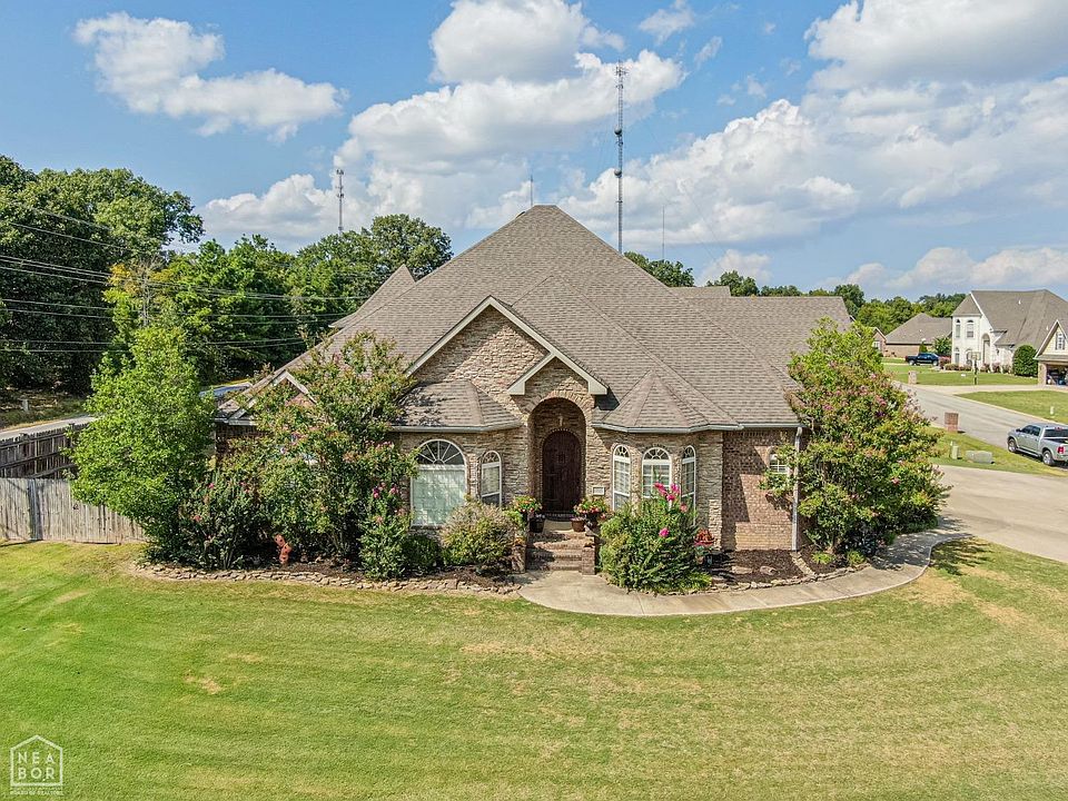 Elegant and inviting, this stunning brick and stone home home boasts exceptional curb appeal on its spacious corner lot. The landscaping frames the property, while the side entry garage and half circle driveway provide convenience. Step inside to discover 4,441 sq. ft. of living space that has been thoughtfully designed. Step through the front door to the dining room and living room that sets the stage for memorable gatherings. Off the living room you will find two generously sized bedrooms, completed by a guest bathroom. It's the primary suite that seals the deal on this home. Enter into your own personal oasis featuring a massive bedroom and ensuite with a tiled shower, jetted tub and closet that doubles as a safe room- providing peace of mind. Upstairs awaits more possibilities with two additional bedrooms, full bathroom, oversized storage closet, media room and a loft overlooking the living room that currently serves as a home office. Recent updates include paint, LVP flooring on main level as well as two HVAC units, exterior garage lighting and several windows.