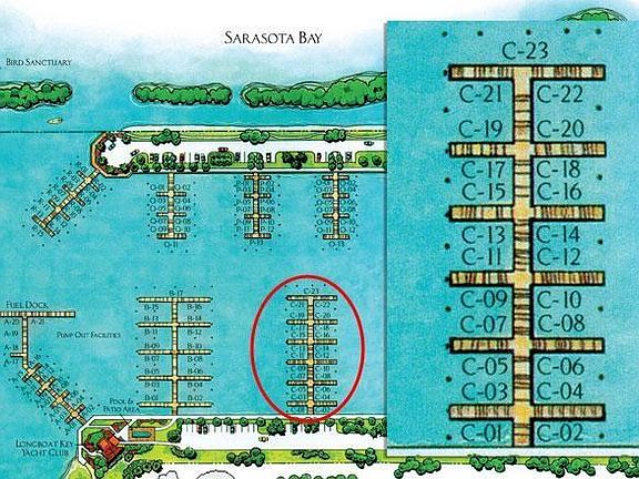55 x 20 ft. Boat Slip with exceptional views of Sarasota Bay on the east side of the marina along with a very desirable location just inside the T-dock for ease of access, at Longboat Key Moorings Marina. Direct access to Sarasota Bay and the ICW. The deep water marina is as much a luxury resort as any other neighborhood on the island, thanks to individual slip ownership, Marina village that includes restaurant, shopping (close to Publix, CVS, and other specialty shops), recreational and social activities, on-site maintenance and concierge services. Cable television, electric, water and wireless internet access at each slip. The Marina has everything a boater could need. Membership at the Longboat Key Club is available for an additional fee.