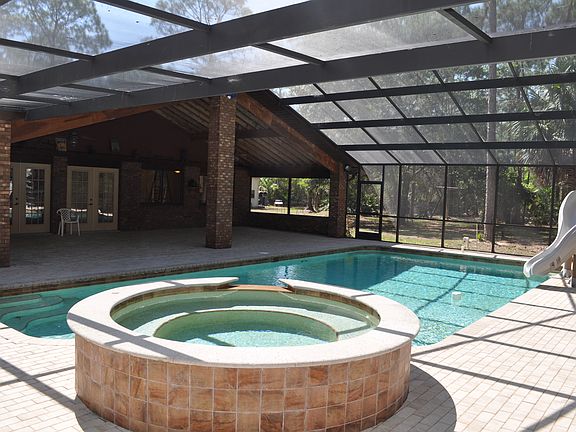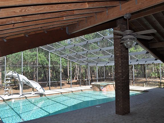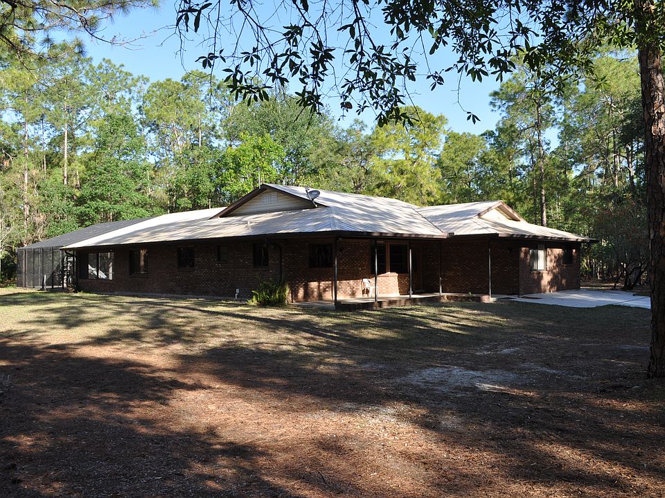 Back on the market -- buyer's financing fell through. Enjoy your morning coffee on the screened lanai while watching the deer and wildlife visiting from the nearby nature preserve. Located on 10 acres of pine forest with wildlife galore, this home is very private yet close in. The 4-bedroom + den / 3 bath home offers plenty of room for a large family and entertaining with a generous-sized kitchen with quartz countertop and wraparound breakfast bar that can easily handle a large group. The oak floors complement the open concept by extending from the front door all the way through the house to the french doors leading out to the lanai. Open the french doors and step right out onto the large covered/screened lanai to the 18' x 38' swimming pool with slide and 7' spa with waterfall. Park your boat or RV on the 40' x 40' concrete pad or build a new barn or storage shed. The split bedroom floorplan offers a large master with walk-in closet and updated master bath with dual sinks. There are plenty of ceiling fans throughout. The oversized utility room features a sink, 2nd refrigerator and large walk-in pantry. Enjoy all the benefits of country living while still living close in!