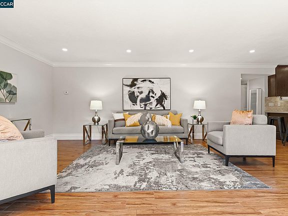 Beautiful single-story condo ideally located near downtown Walnut Creek offers a sunlit haven enhanced by recessed lighting, crown molding, & luxurious laminate floors that flow throughout the home. The main living space enjoys a generously sized sliding glass door opening seamlessly to a private enclosed patio, offering a perfect retreat surrounded by lush greenery. The gourmet kitchen features quartz countertops, stainless steel appliances, an elegant tiled backsplash, & spacious kitchen counter seating, complemented by a cozy breakfast nook. Down the hall you'll discover two guest bedrooms sharing a convenient hall bathroom complete with shower/tub combo. The master ensuite offers ample closet space with its own bathroom complete with an updated shower stall & modern finishes. Enjoy the benefits of in-unit laundry with your full-sized washer & dryer. Additional features include dedicated storage unit & parking space, community amenities such as a swimming pool & laundry facility. Condo location offers top-rated Walnut Creek Schools! It’s also close to BART, freeway access, downtown Walnut Creek and just steps to regional trails.