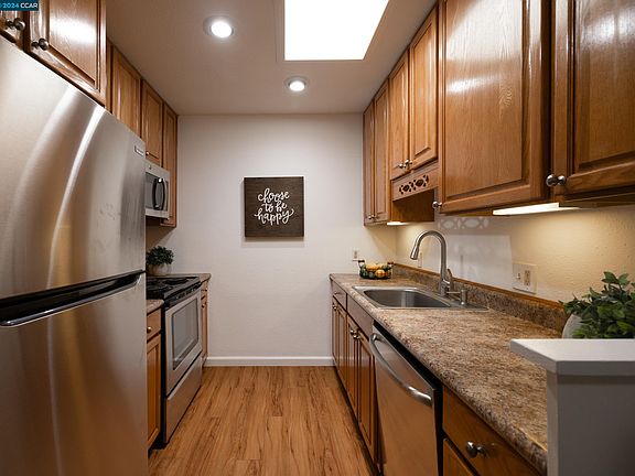This lovely executive condo is nestled in a greenbelt of wandering pathways and mature trees in the popular wooded Northwood Community in Downtown Walnut Creek. The updated and immaculate 1,088 square foot end unit offers a bright and open floor plan with 3 bedrooms, 2 full bathrooms and private patio with freshly painted interior, laminate flooring, new carpeting and stainless-steel appliances. It's the perfect place to call home. Additional features include a storage locker outside of the front door, additional large, dedicated storage unit & covered parking space conveniently located directly outside the home, as well as plenty of permitted parking spaces. The home is only steps away from the gated pool, club house and laundry facility. Centrally located in Walnut Creek, this executive home is close to Walnut Creek's best award-winning schools (Walnut Creek School District and Acalanes Union High School District), with easy access to both BART and 680 Freeways. Enjoy retail, dining and entertainment at the Broadway Plaza. For outdoor fun visit popular neighborhood parks including Walden Park and Larkey Park which hosts many concerts, events and activities year-round! For nature enthusiasts, enjoy biking or hiking on the Iron Horse Regional Trail only steps away!