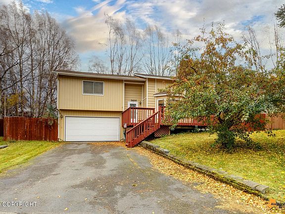Located in Southwest Anchorage within Village Green Subdivision at the end of a cul-de-sac. This tri-level home features a spacious centralized living room on the main floor with vaulted ceilings up to the open kitchen & dining that overlook the living area. Two bedrooms upstairs and full bath with the third bedroom, bath, and laundry on the lower level. A tiered deck extends around the homecapturing southern sun exposure and providing access to the fenced backyard. Long time Owner improvements include flooring, windows, heating system, driveway re-surfacing, and roof replacement.