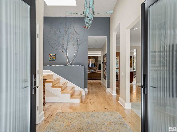 Truly beautiful and right across from Lake Stanley with direct beach access & lake views, this custom home sits on a corner lot within the 24-hour guard-gated community of Lakeridge Shores, offering a striking blend of elegance and serene natural beauty. Though unassuming from the outside, the interior reveals an open floorplan that was designed by a renowned local architect and is full of architectural interest, including high ceilings with solid wood beams, skylights, and an abundance of natural light., The oversized west facing windows were thoughtfully incorporated to capture serene views of Lake Stanley and the majestic Sierra Nevada mountains beyond. Spanning 4,225 square feet, the 4-bedroom, 4.5-bathroom home exudes timeless sophistication including stunning new full pane privacy front doors, upgraded solid hickory wood flooring throughout the main living areas, and three beautiful gas log fireplaces, adding warmth and charm to the living room, family room, and master suite. Outside, the landscaping is equally impressive, featuring professional, low-maintenance gardens and lighting that complement the lush natural surroundings and enhance the homes overall appeal. With convenient access to Lake Stanley right across the street, the home is steps away from a variety of outdoor activities like fishing, kayaking, or simply soaking in the views while relaxing around the firepit. The amenities also include access to a clubhouse as well as tennis and pickleball courts. Lakeridge Shores is not just a private community, it’s a lifestyle, conveniently located just minutes from downtown, Midtown, the airport, shopping, and excellent dining. Zoned for three of Reno's top-rated public schools, this home offers a truly exceptional opportunity to live in one of Reno’s most tranquil, sought-after gated communities. Check out the 3D tour.