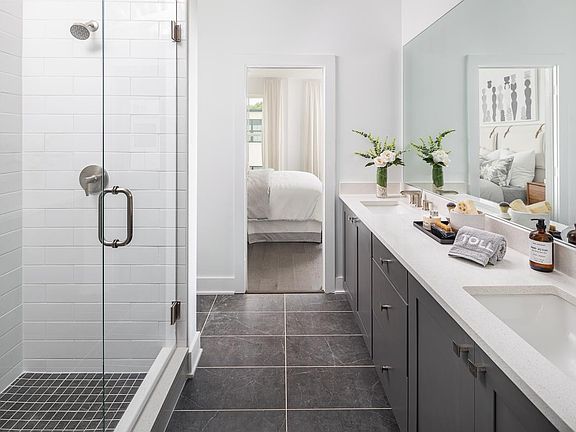 The McKoy's welcoming staired entryway and inviting stairs to the living level reveal the spacious living room, lovely dining room, and desirable covered balcony. The well-designed kitchen is highlighted by a large center island with breakfast bar, and plenty of counter and cabinet space. The charming primary bedroom suite is complete with an ample walk-in closet and spa-like primary bath with dual-sink vanity and luxe shower with seat. The sizable secondary bedroom features a walk-in closet and private bath. Additional highlights include a convenient powder room and thoughtful workspace on the living level, centrally located laundry on the bedroom level, and additional storage on the garage level.