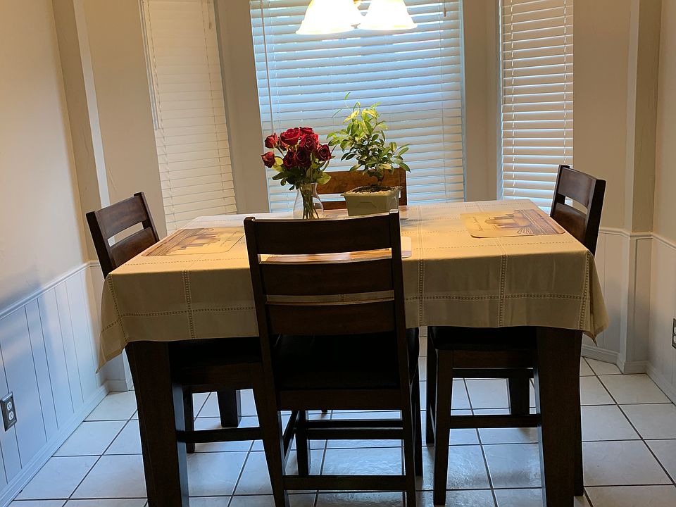 Spacious home has four bedrooms, two with walk-in closets, and two-and-a-half bathrooms. Two dining rooms--formal has beautiful chandelier, and breakfast nook has bay windows to back yard. Large kitchen has lots of cabinet storage, glass top range, brand-new over-the-range microwave, as well as a built-in desk area with overhead book shelves. Utility room off kitchen with pantry. Two living areas--family room with fireplace (incl. gas starter), built-in bookshelves and ceiling fan; formal living could be used as home office or playroom. Two-story house with zoned heating/air conditioning (i.e., separate units replaced in 2003) and programmable thermostats, with 14-SEER air conditioning for increased energy efficiency. Wood front door with Low-E glass replaced in 2007. Double hung thermal windows new in December 2007. Two-car garage with large work space as well as recessed space for freezer or refrigerator. Storage shed in back yard. Corner lot with privacy fence. Covered porch and covered patio. One-year home warranty.