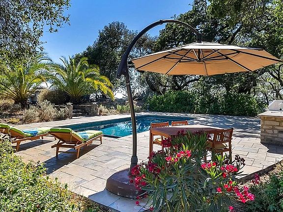 Stunning wine country estate set on over 17 acres with privacy and spectacular views. The main residence and guest house have high quality finishes throughout. A curved wall of windows and doors in the living room leads to the view terrace for easy indoor/outdoor living. Solar heated pool surrounded by a slate patio and outdoor kitchen. Guest house with 1BR/1BA,full kitchen, A/C, 2 car garage. Conveniently located w/easy access to Hwy 101 and 1 hr to SF.