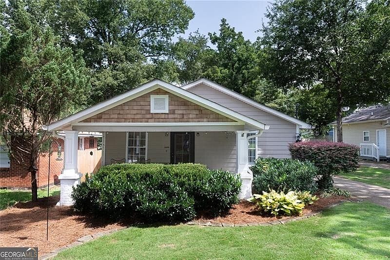 Welcome to this charming renovated Craftsman bungalow in popular White Oak Hills, featuring a delightful rocking chair front porch. The open concept layout is perfect for modern living, with a spacious living room that includes built-in shelves for books and TV. The dining room seamlessly connects the living room and kitchen, making entertaining or watching the big game from any area a breeze. The beautifully updated kitchen boasts white cabinets, granite countertops, a breakfast bar, new stainless steel appliances, a walk-in pantry, and ample storage. Guests will appreciate the convenient half bath, keeping your full bathrooms private. The master bedroom offers a serene view of the backyard and includes an en-suite bath with a storage closet, tile floors, and modern white finishes. Two secondary bedrooms share a spacious, updated Jack and Jill bathroom. The large fenced backyard is perfect for an in-ground pool or a game of touch football, featuring an outdoor patio for dining and grilling, along with a new storage shed. Located close to Decatur Square, Avondale Estates, The Beltline, East Lake Golf Course, Oakhurst, and Kirkwood, this home provides easy access to Interstate 285 and Interstate 20, Emory, The CDC, shopping, and numerous restaurants. The neighborhood is also zoned Tier One for the Museum School.