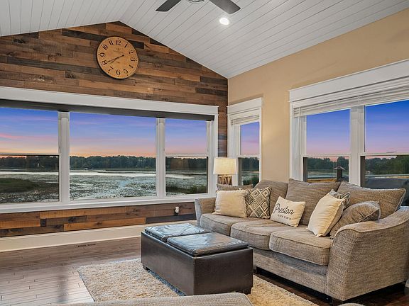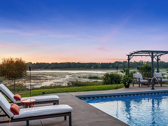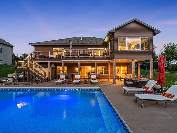 This is the one! Built in 2015, this 5-bedroom, 4-bath home combines modern luxury with endless entertainment options. Situated on "Sunset Drive" for a reason: this west-facing lakefront home offers breathtaking sunsets and resort-style living year-round. Step inside the open-concept main level and take in the sweeping lake views. The home is thoughtfully designed with walk-in closets featuring custom built-ins, dual laundry one on each level, and a seamless flow for gatherings and everyday living. The lower level is an entertainer’s dream - complete with a wet bar, game room, sauna, and a movie theatre living room. Surround sound extends both inside and out, making every gathering unforgettable. Outside, enjoy a sparkling in-ground pool overlooking the lake, your own private dock, two boat lifts (included with sale), and space to relax or host in style. Park in the insulated and heated 3 stall garage with plenty of extra storage space. This home truly checks every box: privacy, luxury, functionality, and the ultimate lakefront lifestyle.