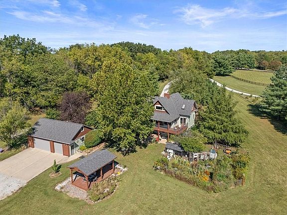 Back on the market, through no fault of seller or the property. PRIVATE COUNTRY ESTATE, but close to everything! Beautiful 3 bedroom plus 1 nonconforming bedroom, 2.1 baths on 10.7 acres. Large walls of windows let you enjoy the outside from inside. Home, riding arena, established riding or walking trails in the woods and barn all overlook the shared pond with island that has bass and bluegill. 50x30 Barn has frost free water and electricity, also has room for 2 stalls. 18x26 Carport, a covered pavilion, 2 loafing sheds with water.  Lots of gorgeous landscaping that has manual drip irrigation with manual timers.  Back patio has a 220 outlet for hot tub. 36x25 3 car detached garage also has above storage. Don't miss out on this exquisite property!