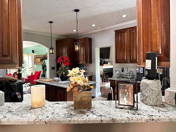 This expansive house offers nine rooms and spans 2,092 square feet. The property is thoughtfully updated with numerous modern amenities and features. With a swim spa, hot tub, heated bathroom floors, whole-home generator, new flooring, new roof, new siding, and a new heating system, it provides practical comforts for everyday living. Two detached garages also offer ample storage and parking space The kitchen, a highlight of the home, is large and includes a center island with granite countertops. It is equipped with a stove and wall oven, and there's a bar area with seating that looks into the kitchen. Cherry cabinets add a warm touch to this functional space. The master bedroom has doors leading to the back deck and hot tub, offering easy access to outdoor relaxation. The modern bathroom