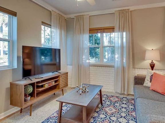 Immerse yourself in the history and southern hospitality of Savannah with this historic home that exudes old-world charm. Nestled into a historic fishing village just minutes from downtown, this property features a live oak covered in Spanish moss, a gazebo, beautiful outdoor spaces, and original terrazzo floors. The home includes a fully updated and renovated 3-bedroom and 2-bathroom layout, with an attached studio apartment adding another bedroom and bathroom. This coastal beauty has been transformed into a fully updated home, complete with a modern kitchen featuring new shaker-style cabinets and all necessary appliances, including a refrigerator, dishwasher, microwave, toaster, coffee maker, oven, and stove with overhead range hood. The open-concept kitchen and living area, equipped with a sofa bed and a 50" Roku TV, is perfect for entertaining and socializing. The master bedroom boasts a king-size bed, while the second bedroom has a queen bed, and the third bedroom offers two twin beds. The studio apartment, a tastefully converted former garage, includes a small kitchenette, a queen bed, and two pull-out sofa beds. Outside, enjoy sunny days in the gazebo. We are a pet-friendly home, requiring a non-refundable pet fee. Pets must be crated when left unattended, are not allowed on furniture or beds, and all waste must be cleaned up from the yard. Additional cleaning costs due to pets will be charged if necessary. Located just north of Victory Drive and south of Bonaventure Cemetery, this residential area is ideal for those who prefer driving, though Uber and Lyft are readily available. Minutes away from the renowned Bonaventure Cemetery, downtown Savannah, and the Thunderbolt Historical Society, this home offers both convenience and charm. The pool is currently closed for maintenance, with weekly maintenance and cleaning performed. Access to the yard and pool area is required on service days. Check-in and check-out are automated with a digital keypad lock, and guests will receive access information via email and text. A signed rental agreement is required, and guests must be 21 years of age to book. Evidence of pet hair on furniture, excess hair, stains, or waste will incur additional cleaning charges.