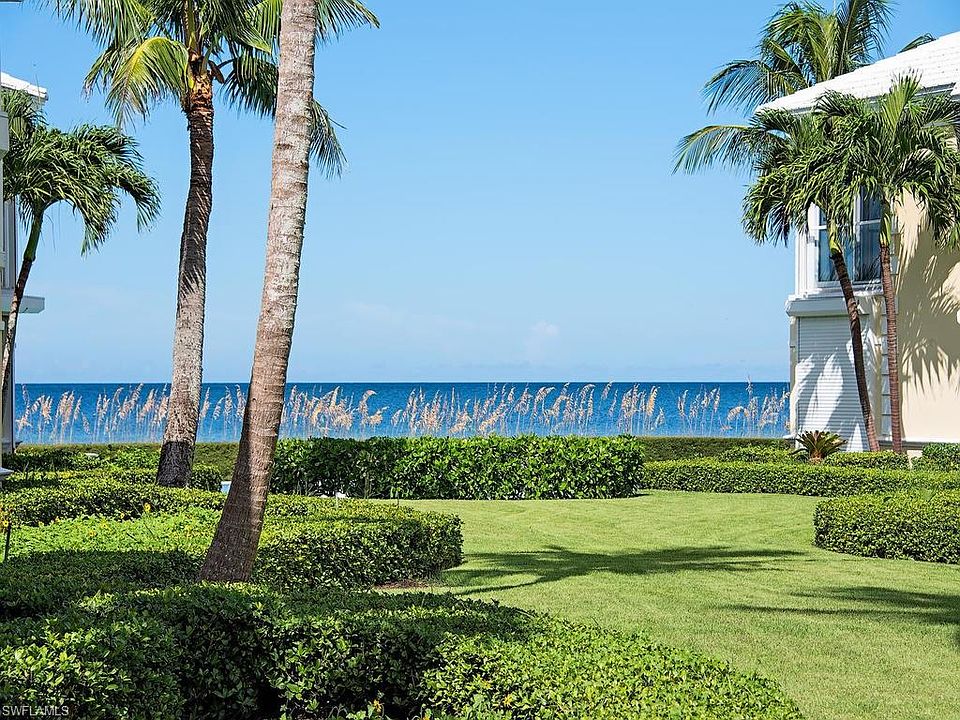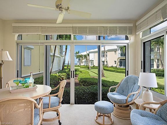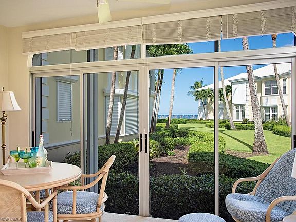 Tucked in its own tropical oasis and steps to the beach, this beautiful ground floor Billows unit featuring impact glass windows and electric storm shutters, is a beachfront jewel. Neutral tones flow throughout the open, spacious living room and dining room. A sleek built-in bookcase and TV area add a decorative touch and plenty of storage. Enhancing the open interior is a charming Florida room, the perfect place to enjoy the beautiful Gulf views. The light and bright kitchen highlights white cabinetry and appliances, a tile floor and double stainless sinks. Located in the heart of the Moorings, this charming and well maintained, beachfront complex offers the perfect Naples lifestyle. This unit comes with a deeded, covered parking space, a large storage area perfect for all your beach gear and a private lanai area where you can enjoy the beautiful outdoor weather.