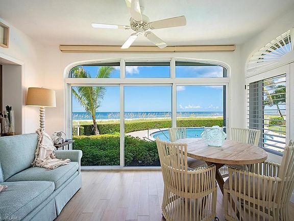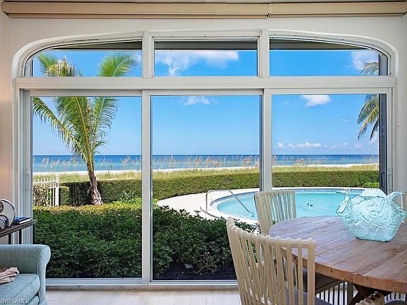Own your little piece of Paradise today. This unique Moorings property is only a few steps to the white famous beaches of Naples. Enjoy the sunset from your own private patio every evening. The kitchen, bathrooms, porcelain wood tile flooring, impact glass, beautiful crown moulding and plantation shutters were all replaced in 2011. And in 2017 all of the furniture was updated by an award-winning interior designer to fully capture the feel of beachfront living. The Gulf views from your family room are spectacular. This stunning, fully furnished first floor beachfront property can now be yours. Please call today to schedule a personal showing.