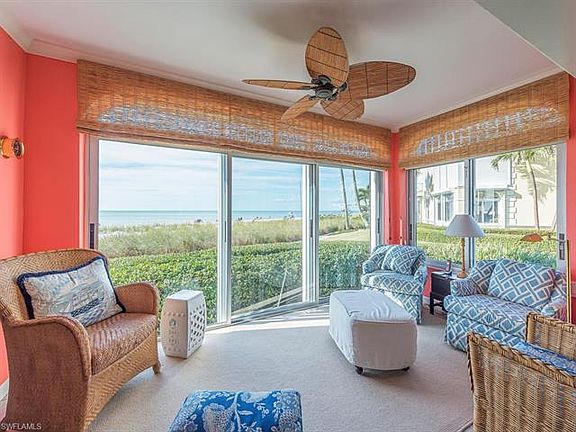 Location is everything! You have a better chance of winning the lottery than finding a beachfront unit like this one! Just steps from your private patio to the white sand of our famous Naples beach. This meticulous, one-of-a-kind first floor, gulf front unit is so spectacular you must see it to believe it. Sunshine and sea breezes by day and gorgeous nightly sunsets light up your evenings from the large, unobstructed window view from the Florida room. Located directly on the beach, this spacious 2 bedroom 2 bath cooperative features a beautiful kitchen dressed with solid surface counter tops and quality, solid wood cabinetry with separate breakfast area. Living area is light and bright with plantation shutters and neutral tile/carpet. Master and guest bedroom each have a private patio with new tile and are just steps to our world class beach. New A/C and roof is only 2 years old. See the boats from Doctor's Pass!
