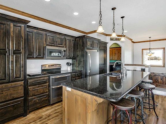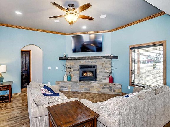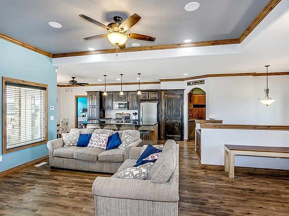 Exceptional custom-built home with fantastic features and upgrades, 5-car garage and on 2.95 acres! The floor plan features an open living, dining and kitchen area with beautiful LTV flooring. The living room is warm and inviting with a zero-clearance wood-burning, stone fireplace and mantle beam. The kitchen showcases knotty alder custom cabinets, large quartz island with eating bar, matte-finish stainless steel appliances, and large walk-in pantry. The dining area has a built-in bench for extra seating and opens to the covered patio for easy grilling. The master bedroom is spacious and comfortable with an awesome trayed ceiling, indirect lighting, crown molding and stylish sliding door to the master bathroom. The impressive master bathroom includes two separate granite vanities and floor-to-ceiling storage, tile floor, oversized walk-in shower, huge walk-in closet, and an extra, hidden closet area with built-in custom storage. The master bathroom connects to the main floor laundry area which includes a quartz counter with sink and a large entry bench - perfect for coats and bags. The main floor also includes two additional bedrooms, and an adjacent bathroom with tub/shower and quartz-topped vanity. The finished basement in this home is so amazing - spacious family room, 3 additional bedrooms, 1 1/2 bathrooms with granite vanities, large office, safe room, an awesome theater room, and a custom rustic barn metal drop ceiling throughout much of the basement area - so stylish with vintage glamour! The office also has an incredible 1.5 ton vault door (yes, a real vault door) to the 15'X8" concrete storm room with 12" poured concrete walls, and the safe in the storm room stays. This home has the ultimate home theater with a custom sliding door entrance, a 15'x25' built-in riser, built-in lounging on the upper level and a dedicated home theater system including: 150" 16:9 4K acoustic woven material fixed frame screen with speakers behind the screen, full 9.2.4 surround sound with 4 rear-mounted speakers, and an Epson 5040UB True 4K projector. This home also has a incredible 5-car garage with 4 garage doors, and is 60' pass-through from front to back, 1416 SF with 11' ceiling, and an epoxy coated floor. Additional interior features whole-house audio system: HTD Lync 12 system, 12 zones (including garage and patio), 60 speakers (36 on MF, 24 in bsmt), 2 bluetooth input panels, 4 DMA 1240 amplifiers, integrated doorbell/intercom, wired for Kanokla Internet Point-to-Point service, wired for Cat6/Gigabit Ethernet Access in every room, Honeywell Alarm system with 2 tuxedo access panels. Exterior features full brick and stone, Class 4 composition shingles, 450 SF covered rear patio with speakers and 3 outdoor fans, LP smart siding soffitts/eaves, triple-pane low E windows, buffalo grass, rocked circle driveway, and trenched rain gutter and sump pump drainage to ditch. Additional features include: R60 blown-in cellulose attic insulation, R13 blown-in cellulose wall insulation, 4 ton geothermal water-source heat pump with 2 wells (1 supply, 1 return), 1000 gal. septic tank with laterals, reverse osmosis filtration system with ultraviolet protection, Nuvo citrus water softener system, DrainVac whole-home central vac system. Enjoy the amazing features of this newer home and the awesome sunsets from the covered patio - perfect to share with your family and friends.