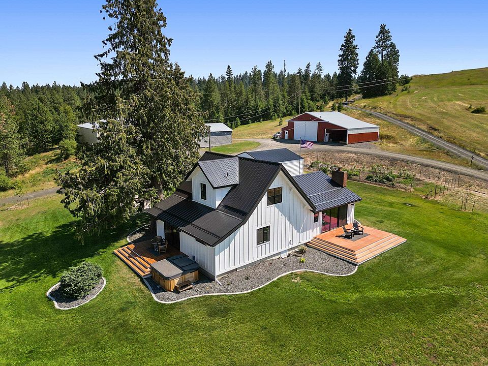 Beautifully restored 1916 farm house after a complete remodel blending traditional and contemporary designs. Private, gated road leads to your 40-acre property. Enter into natural light with stunning views of the Palouse, Mica Peak and Idaho mountains. The kitchen mixes farmhouse charm with GE Café functionality. Double oven, maple cabinets, floating shelves, rustic whitewash brick, pot filler over stovetop, lovely farm sink, Revival lighting, spacious refrigerator, and built-in mixer cabinet. Main floor master BD has a glowing built-in fireplace. Through the sliding barn door is a master BA with gorgeous soaker tub, double vanity, spacious walk-in steam shower, and walk-in closet. Up the lighted stairs are two more BDS and a BA. Reinforced insulation provides interior/exterior protection and new heating/cooling for comfort in all seasons. Unwind in the hot tub or relax on the deck and take in spectacular views from this magnificent property. NOTE: 40x68 Heated Shop, 26x28 2 Car Gar, 40x100 Barn.