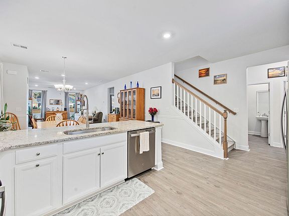Welcome to this rare end-unit townhome in the highly sought-after Belle Harbor at Market Common! Offering a picturesque pond view, this beautifully maintained home features an open and inviting floor plan with luxury vinyl plank and tile flooring on the main level, with carpet and tile upstairs. The spacious kitchen boasts granite countertops, stainless steel appliances, and ample cabinet space. Ceiling fans in every room provide year-round comfort. The primary suite is conveniently located on the main floor, featuring a walk-in tiled shower, double vanity sink, and generous walk-in closet. Upstairs, you’ll find two additional bedrooms, a full bathroom, and a versatile loft area—ideal for a home office, playroom, or extra lounge space. Outside, enjoy the private patio with an attached storage unit and a gas line for outdoor cooking or a hot tub—perfect for entertaining or relaxing. Additional highlights include a two-car garage, natural gas utilities, and access to all the amenities of Market Common, including shopping, dining, and entertainment. Don’t miss this rare opportunity—schedule your showing today!