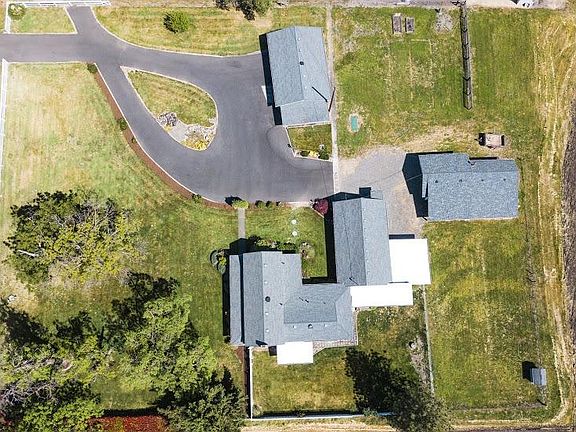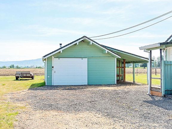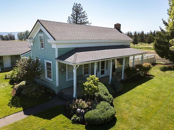This farmhouse with over 2000 sq. ft, 3 bedrooms and 2 bathrooms sits on 1.24 acres was built in 1855. The home has the charm and unique architecture of that era in history. Inside you will find a large living room with wood stove, a wonderful dining area and a large kitchen with plenty of cabinet space. The master bedroom is located downstairs. Upstairs you will find an additional two bedrooms and bathroom. Great mud room and indoor laundry room. Outside you will find two detached garages. There is another outbuilding that has a huge bonus room as well as a room that was the storage fruit room. Gorgeous manicured landscaping, views of the mountains and Mt. McLaughlin. Great set up.