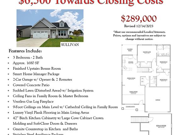 MOVE-IN READY!! New Home, minutes from I-26/I-85 in Spartanburg - 3 BR, 2 BA plus a finished bonus room! Luxury Vinyl Plank flooring in Main Living Areas - Corner Gas Log Fireplace and Cathedral Ceiling in Family Room - Covered Back Patio - 42" Kitchen Cabinetry w/ Large Cove Cabinet Crown Molding & Soft-Close doors & drawers and Stainless Steel Appliance Package. Granite Countertops in Kitchen & Baths - Double Sinks, Garden Tub and Separate Ceramic Tile Shower with Corner Bench & Frameless Glass Shower Door in Master Bath - Smart Home Manager Package *Builders 1+8 Home Warranty Included. $6,500 towards closing costs with our preferred lender and closing attorney