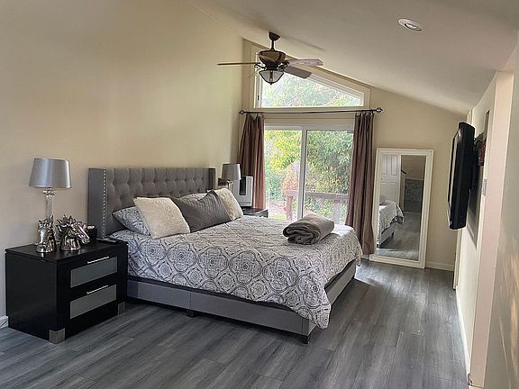 A charming sunshine filled home,expanded in 2012. Surrounded by nature on a rare flat lot with lemon trees & blackberry bushes in a quiet cul-de-sac. Granite kitchen, separate laundry w/ sliders to the side patio. 3 skylights (2 operable).Vaulted exposed beam ceilings in entry, hard wood floors. 2 bedrooms up + full bath. Den/family room.Approx. 24x12 Huge Master w/ vaulted ceilings overlooking yard. 2 ceiling fans, heated travertine bathroom floors in master bath, separate shower, jacuzzi spa tub,double sinks, private yard, huge driveway, private, storage shed in yard. Bike paths close by, Safeway,Starbucks, up-scale restaurants,library, schools, transportation.