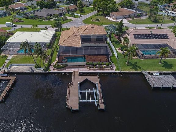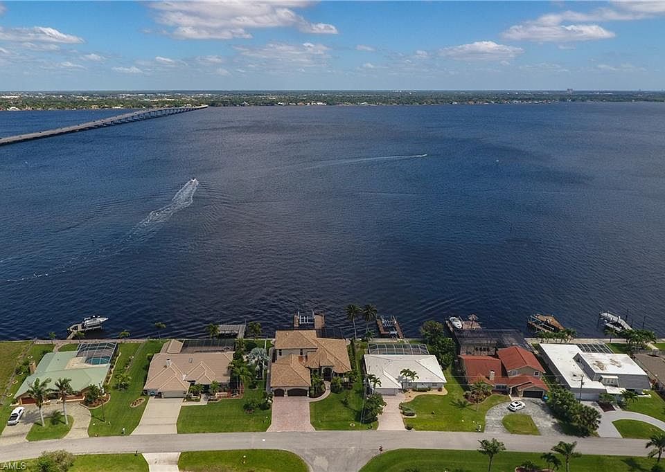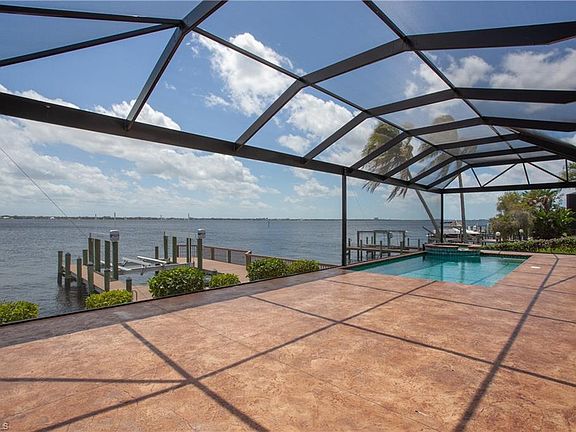 It's a vacation-every-day dream life at this remarkable Riverfront home with expansive, tranquil views across one of the widest spans of the Caloosahatchee River. Built in 2016, this Direct Gulf Access, 2 story home is 3,500 sq feet under air with 5 beds, 4 baths (1 is also a pool bath), Den, and a deep 3 car garage. It's a perfect setting for family gatherings, entertaining, and also checks all the boxes for a profitable seasonal vacation property. The 27,000 # lift sits in the oversized walk-around composite dock. You'll fall in love once you step out to the huge lanai with a covered entertaining area, summer kitchen, and a sparkling pool & spa (saltwater with electric heat) overlooking that breathtaking wide river view. Inside are striking coffered ceilings and soft inset lighting. The great room has wet bar and gourmet kitchen with gas cook top and double oven. The second story retreat has its own screened terrace, pocketing sliders, 2 beds, full bath, and a bonus room for use as a separate sitting area, game room, studio, nursery, or...? Schedule a private showing and it will be easy to envision yourselves living the dream in this remarkable Riverfront home!