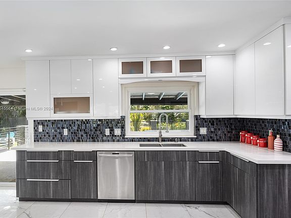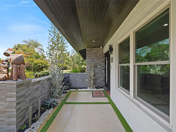 Welcome to your dream oasis! Beautifully remodeled 3/2 ranch-style home sits on an expansive, almost 30,000 sq ft lot! The kitchen features top-of-the-line Bosch appliances, ice maker and wine bar, perfect for entertaining. Plans are included to expand the master/living area for added space. All windows, doors, and garage are hurricane-rated. Home boasts a guest house with a bathroom/shower, complete with new tile floors. picturesque lakefront views and a 20 X 40 saltwater pool surrounded by travertine pool deck. The outdoor BBQ area features built-in appliances, including a KamadoJoe smoker, ideal for outdoor gatherings. Additional amenities include an outdoor shower, fire pit area, and shed. With updates like a 2018 roof, 2019 A/C, and a water heater from 2022.
