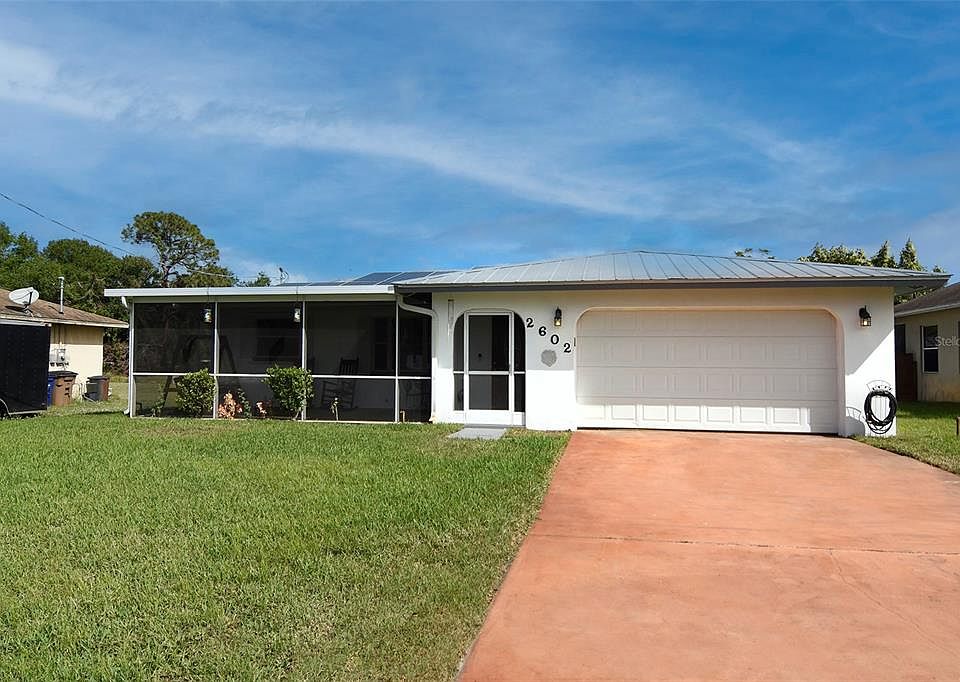 Perfectly charming 3 bedroom 2 bath plus den home with metal roof and solar panels! Watch the sunrise on the screened back porch while you sip your coffee or catch the sunset on the large screened in front lanai. Ready for its new owners to walk in and make it their own. Fresh paint with beautiful new flooring throughout the whole home with a newly remodeled kitchen. So much room in the family room to spread out and huge dining room right off the kitchen. Split floor plan is another great features...two nice size bedrooms and recently remodeled guest bathroom are right off the large living room. Home has an entire master suite that can be shut off from the rest of the house. Zero damage from hurricane Ian. Your new home has solar panels that make the electric bill a non factor. Garage has a a separate laundry room with wash tub and a pulldown screen at the garage door that keeps the bugs out and lets the breeze in. This home has had one owner its whole life and has been loved and cherished but now it is time for new owners to make it their forever home. Wind mitigation and four point inspections have been completed recently and available. Close and convenient to everything!