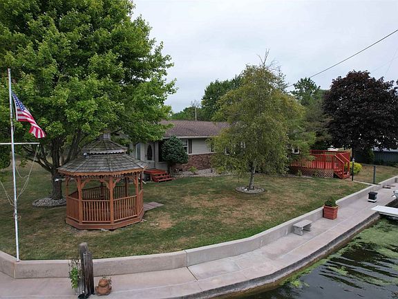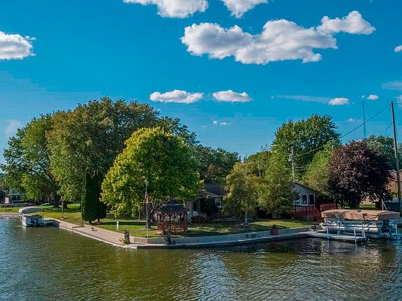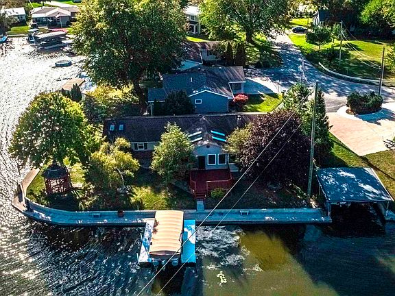 Location, Location, Location with unforgettable sunrise views across the lake. Premier west shore corner lot on Lake Manitou's Wolfe Point. 115 feet of lake frontage plus an additional 77 feet of channel frontage. Newer concrete seawall with walkway on lakeside and channel side. Panoramic and picturesque views from huge vaulted ceiling family room with plenty of windows overlooking the lake, plus a second south facing secluded four season sunroom off the bedrooms with views towards the Nature Preserve. Two vinyl boat docks and cozy gazebo included. Living room fireplace insert also included. This 3 bedroom, 1.5 bathroom home has been loved and enjoyed by one family for over 30 year and is now ready for new owners to make it their own.