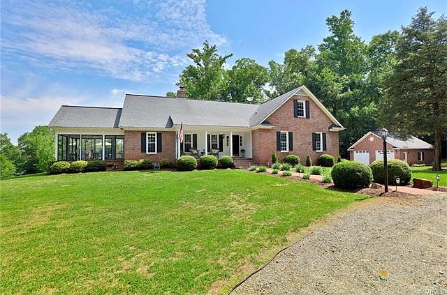 One of a kind, 10-acre waterfront country estate on the Appomattox River, immaculately maintained brick Cape with 5 bedrooms, 3.5 baths, full walk-out basement. Completely private, surrounded by nature, watch eagles, deer, osprey & wildlife, plenty of room to enjoy the outdoors and gardening! Hunt, fish, kayak & canoe right at home. Surrounded by 500 acre Chesterfield Berry Farm, this property offers park-like grounds, nature trails for your 4-wheelers, two-tier deck overlooking river & pool, lovely sun room with panoramic views, walk-out basement with recreation room with wood stove + brick fireplace with gas logs, half bath & ATTACHED GARAGE + DETACHED 28x26 GARAGE/WORKSHOP. Play ground, whole house generator, updated windows with lifetime warranty, wood floors, eat-in kitchen with granite counters, island & sunny dining area with bay window overlooking pool & river. In-ground pool has beautiful stamped concrete patio. First floor master, family room with brick fireplace, spacious living room, formal dining room, utility room with lots of storage space & double utility sink, expandable walk-in attic.