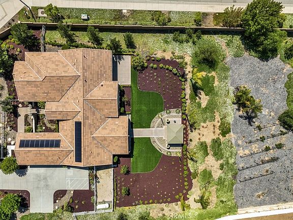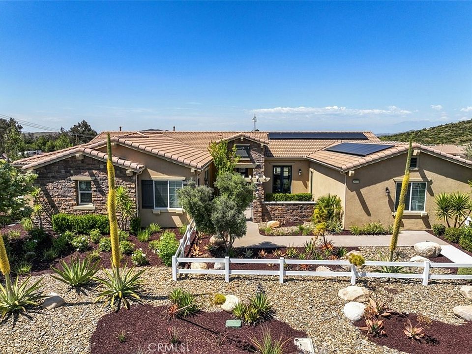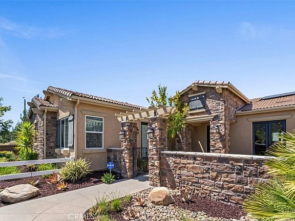 Welcome to this former model home! When arriving curbside at this spectacular home you will notice the detail of a quaint courtyard with gates and mature landscaping on an acre corner lot. This beautiful 3 bedroom with a possible 4th, 3.5 bath home has too many upgrades to list. The 3rd bedroom may be used for multigenerational living with a bedroom, bathroom, living room and its own entrance. The large chef's kitchen is complete with a large island displaying waterfall granite sides, upgraded appliances, an amazing butlers pantry and cabinets to ceiling with glass doors in the kitchen. The open floor concept is breathtaking upon entering the home. Office/flex room space is to the right upon entering the home. It is also an entertainer's dream with a wet bar to the left. The living room has a gorgeous fireplace with stone tile to ceiling complementing the modern feel of the living space. A wall of windows and bifold doors to the patio that allow the natural light to shine through this spacious living/dining area. The Primary Suite is complete with a sliding glass door with a blackout custom shade, a stunning bathroom with a huge shower with floor to ceiling tile, a dream custom closet and a free standing tub to make this a spa like retreat perfect for relaxing. Lastly, the outdoor space has a stunning sunset view with a covered patio, separate gazebo, turf areas and pristine landscaping including a small vineyard. Don't miss out on this exquisite opportunity. Welcome home!