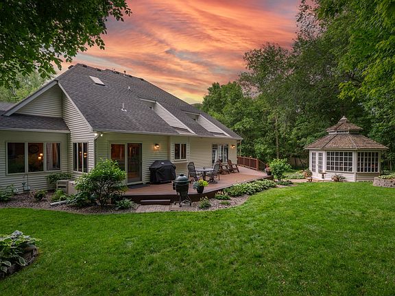 Nestled in a captivating NW neighborhood, this executive home harmoniously blends with its wooded surroundings. The foyer welcomes you to a sprawling layout. The primary bedroom which is on the main level features a walk-in closet, Jacuzzi tub, and shower. A 2010 addition significantly expanded the main floor, showcasing a custom kitchen with granite countertops and a center island. The residence provides both formal and informal dining areas, completed by a gathering room. A curved staircase takes you to the upper level where you'll find two large bedrooms and a full bath. The lower level presents a spacious family room, complete with a wet bar, 3/4 bath, bedroom and workout room. Main floor laundry room. Newer furnace and water heater. The backyard is a true haven for entertainment, boasting a sizeable Trex deck, while a delightful 3-Season Gazebo offers an idyllic retreat for relaxation and unwinding amidst the tranquility of the surroundings.