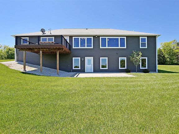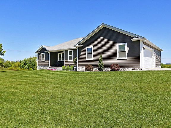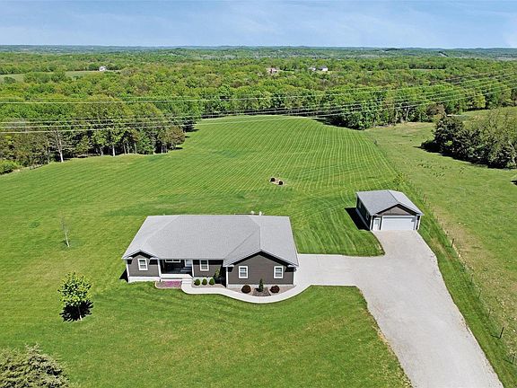 This beautiful home is located on 9.95+/-Acres with a breathtaking view! SERENE AND PRIVATE! Great place for horses! 23 x 28 Detached garage with electric and concrete floor! No Restrictions! The entry into the main level offers an open floor concept of a large kitchen with granite countertops, backsplash, 36"cabinets/crown molding, walk-in pantry and grand center island with seating. Dining area opens to a massive deck (trex boards). Spacious living room with lots of windows to view the gorgeous setting. Divided bedroom floor plan, master suite features walk-in closet, dual sink and shower only. 2 additional bedrooms with carpet. Full hall bathroom and 1/2 bath. Sizable laundry room with utility sink. Walk-out lower level with 9' pour, full bath and lots of windows for natural lighting. Plenty of storage here. 25 x 24 Oversized 2 car garage. Awesome curb appeal, huge patio & deck great for entertaining and fantastic view. Don't miss out, call to make your appointment!