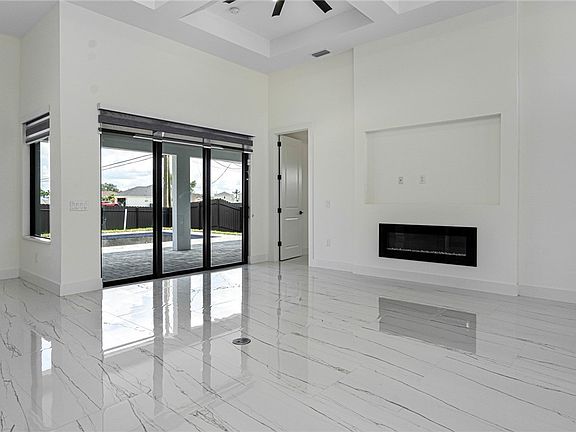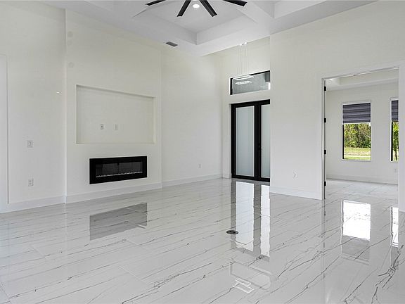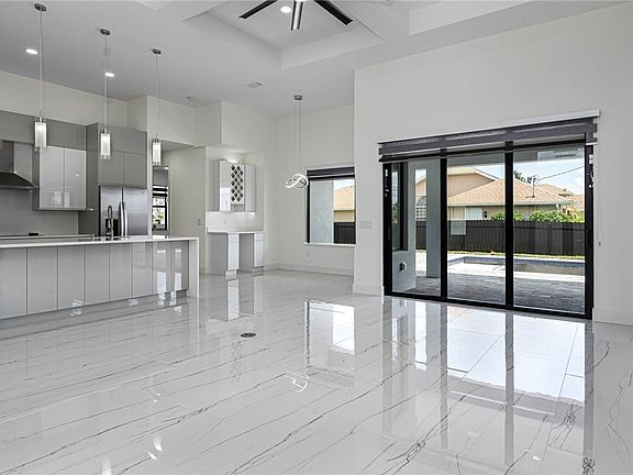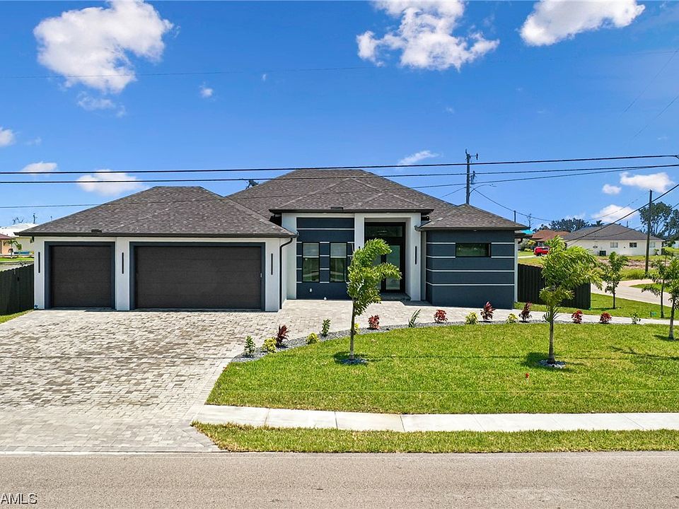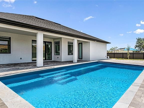 Experience New Custom Upgraded Beautiful 3+Den 3 bath 3 car garage Fenced in Pool Home, Highly desired area of SW Florida. Pavered Circular Driveway and walkway around house with Pavered Under truss Lanai and Large Patio. Impact Doors and Windows Throughout! Upgraded Ultra Modern 2 toned Kitchen with Quartz countertops in both Kitchen and Bathrooms. Stainless Steel appliances, Wall oven Cooktop and Built in Wine rack and other features. Soft close cabinets, upgraded Cabinet lighting, fans and fixtures. Recessed lighting in all rooms. Primary Suite features dual sinks, walk around shower Tray Ceiling. Coffered ceiling in Great room, Custom closet wood shelving in all walk in closets, High polished Porcelain Tile floors throughout. Pool Bath in guest bedroom. Light filtering Window Treatments. Beautiful pool with glass tiles, paver pool deck, and circular driveway with plenty space for parking. Outdoor Summer Kitchen with sink, Propane Cooktop with quartz Counter and a Fenced yard! Upgraded Landscaping with Low voltage lighting to impress the neighbors! New Palms everywhere! Epoxy garage floor and Tesla/EV Port. On City Water and Sewer. Close to Schools and Shopping!