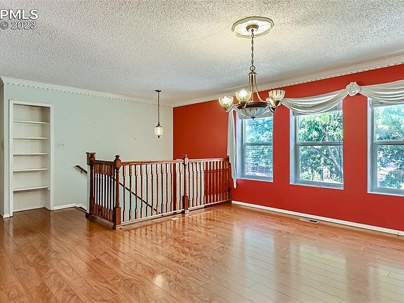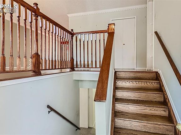 Welcome to this beautiful and well cared for home priced at an incredible value. As you enter you will notice the wood floors, crown molding and open floor plan. The neutral paint colors and bright rooms make this a very inviting home. The large living with lots of windows joins the dining room and kitchen. The kitchen offers ample storage, a pantry and an island with extra storage and eating area. This floor also includes the generously sized primary bedroom with its attached full bathroom. There are also two other bedrooms and a half bathroom on this floor. There is a sliding door off the dining room that takes you out to the very large, covered deck and private back yard. The lower level offers an enormous family room and a full bathroom. The laundry closet is also on the lower level. The two car garage offers generous storage and automatic opener and the fourth bedroom is in front of the garage (non-conforming). This fourth bedroom could also be an office or shop. The front and back yards are xeroscaped and require no watering. This location offers an easy commute to anywhere in the Springs and only 60 minutes from the Denver Tech Center. Easy walking distance to elementary school, park, food and shopping. New roof just installed.