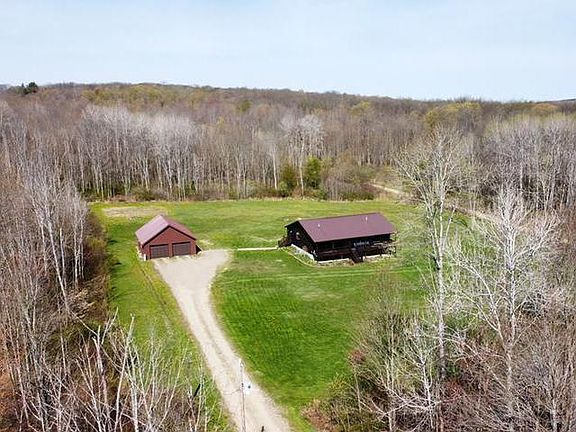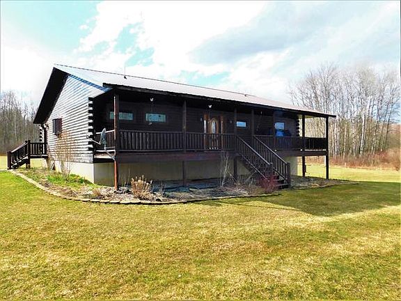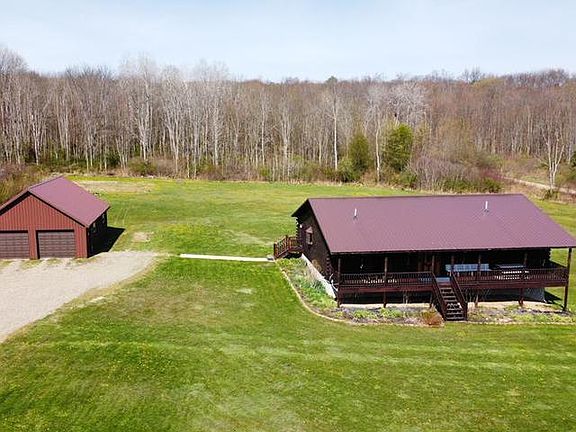 Log home wrapped in rustic style on 63 acres situated on the western NY/PA border! You've found your dream home in this stunning, newer-build with high-end features. The low-maintenance architectural style of this wooden retreat, coupled with its modern amenities provide the perfect balance for easy living. It has luxuries including an open-concept, vaulted-ceiling great room, granite countertops, and stately hardwood floors. The first-floor bedroom is ideal with an attached bathroom featuring a walk-in shower, and a walk-in closet. Other first-floor conveniences include a half-bath, a laundry room, and a mudroom. The lower level offers three additional rooms, and a high-end bathroom. It's an outdoor paradise on the grounds of this peaceful property where wildlife is abundant. The two-story garage, sprawling yard, the creek, and acres of woods including trails for exploring will make you feel like you're on vacation every day. Make this one your own!
