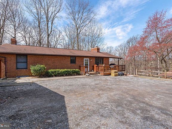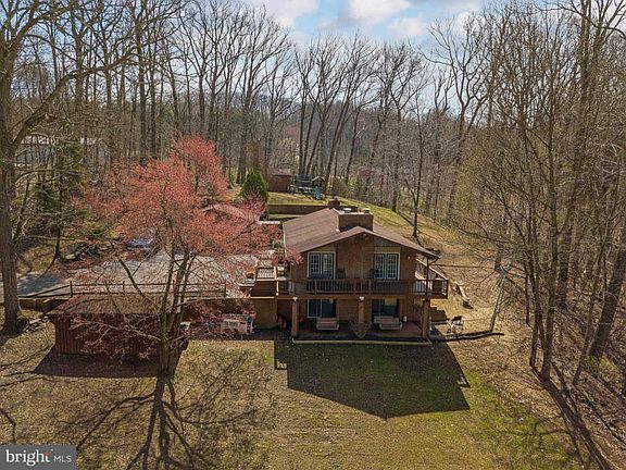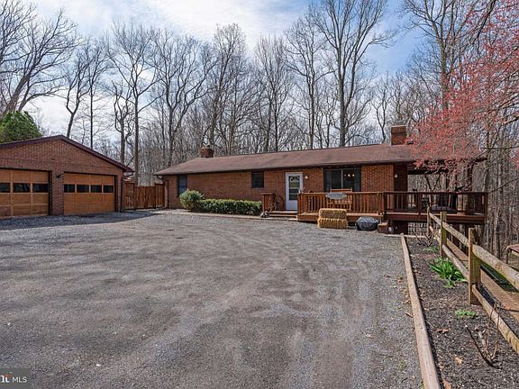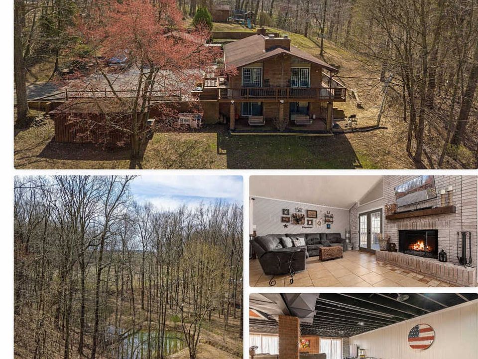 New Roof being installed this month on house and garage. Private Location on over 2.4 Acres. Home features an open living area with vaulted ceilings and 2 wood burning fireplaces. 3 Bedrooms with laundry and Master Suite on Main level with multiple exits to the exterior decks and patios. Basement has be finished and includes the 2nd fireplace and additional room in basement with 1/2 bath and can easily be finished into a full bath. All three chimneys in the home have been relined in the past year and a half. There was also a radon system installed in 2017 as well.The exterior features a large driveway with plenty of parking and a 2 car detached garage and your own private pond. There are an additional 2 sheds plus a wood shed. The heat pump also has a wood fire box to be able to heat the home with wood if you choose to. Dont miss out on this home!!