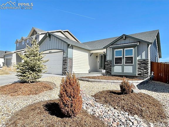 Welcome to this stunning, nearly-new home in the sought-after Hannah Ridge neighborhood, conveniently located near everything you need! This open-concept ranch features luxury vinyl plank flooring that seamlessly extends throughout the main living area and kitchen, offering durability and low maintenance. The vaulted ceilings create a spacious and airy atmosphere. Prepare to be impressed by the kitchen, showcasing elegant granite countertops, rich dark cabinetry, a classic white subway tile backsplash, and sleek dark stainless appliances. You'll enjoy cooking on the gas stove! Relax in the living room by the cozy shiplap fireplace, or step out onto the walkout deck, perfect for entertaining and soaking up the Colorado sunshine. The main level master bedroom includes a generous walk-in closet and a luxurious 5-piece master bath for an indulgent experience. Also on this level, you'll find another bedroom, a full bathroom, and a sizable laundry room. If you're looking for even more space, venture down to the expansive garden-level finished basement, which features upgraded 9-foot ceilings, ensuring it remains bright and inviting. This lower level includes two additional bedrooms and another full bathroom. The property boasts beautiful landscaping in both the front and back yards, allowing you to simply move in and settle down. This home is just minutes away from shopping, dining, and entertainment in the Powers area, with easy access to military installations, Colorado Springs airport, and major highways. Notable builder upgrades include rough-in for a wet bar, pre-wiring for surround sound in the basement, a pre-wired home security system, a gas grill hook-up, and an 8-foot garage height for ample parking and storage. This home has been meticulously maintained, and it truly shows. Schedule a viewing today!