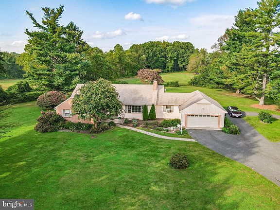 Spacious 5 bed/3 bath, custom built home. Enjoy all of your main level living on this well built brick and wood siding rancher situated on over 9 acres with the home and yard leading to pasture and into five acres of woods with trail and stream. Family room with large bay window and wood stove opens to the separate dining room which leads to an awesome sunroom. Large kitchen with laundry area. Primary bedroom with full bath. 3 more bedrooms and full bath on main level. Lower level includes a partially finished basement with family room and wood burning fireplace, fifth bedroom, full bath, and kitchenette area , plus lots of potential for extra living space. Vibrant and colorful professional landscaping surround this amazing home,. Current owner states that the farm across the street is in Farm Preservation and can not be built on! High Efficiency heating system. The heating system is radiant ceiling heat. Each room is individually thermostated with heat that radiates from wires in the ceiling. It is effective and has never caused any problems in 40 years that the current Sellers have lived there. No repairs or pumps to replace. No oil or propane gas to be delivered.