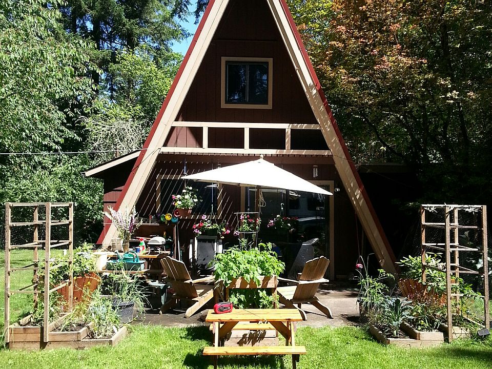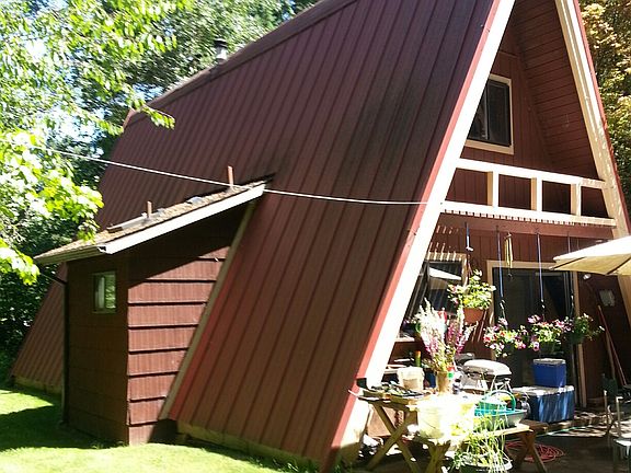 This unique A-frame cabin is in a beautifully relaxing setting with lots of garden space, fruit trees, blueberries,deck, all only a short walk from FernRidge Lake and Zumwalt Park. Cozy interior with wood burning certified wood stove, and a spiral staircase leading to loft. Family room and 3rd bedroom also an option downstairs. Relax and unwind on this property with so much potential! All no spray! Two legal tax lots equals .71 lot.