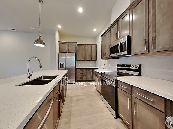 Stainless-steel appliancesQuartz countertopsLuxury plank flooringOpen layoutIsland with a sink