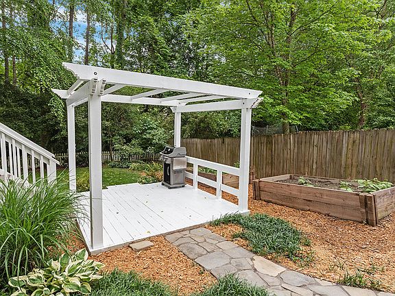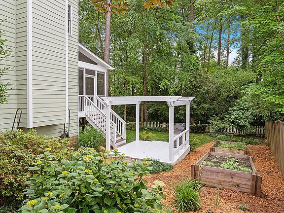 This home features an open living and dining area, perfect for gatherings. The eat-in kitchen boasts granite countertops and stainless steel appliances, with a cozy family room nearby. Outside, a screened porch overlooks the landscaped backyard with raised garden beds and a pergola. Upstairs, find three bedrooms, including a tranquil master suite with cathedral ceilings, a bonus room, and a walk-in attic for storage. Don't miss out on this ideal Raleigh living—schedule a showing today!