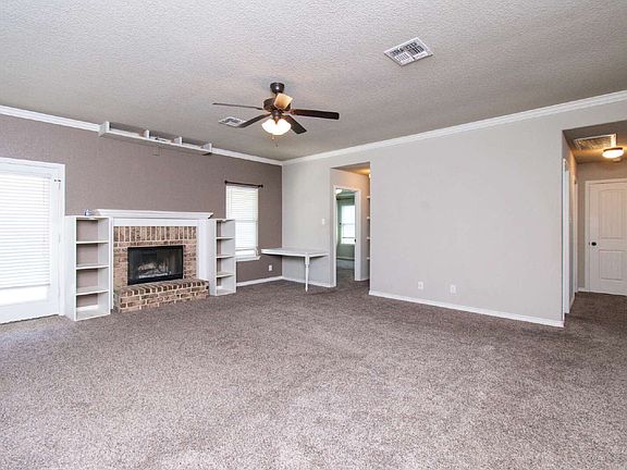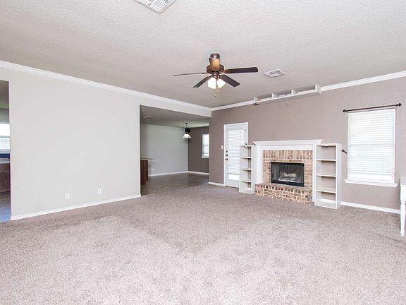 This beautifully detailed home features crown molding throughout and a welcoming fireplace in the living room, creating a warm and elegant atmosphere. The kitchen offers a functional layout with a breakfast bar, custom cabinets, granite countertops, a pantry, and essential appliances. All rooms are decently sized, providing comfortable living space. The primary bedroom includes a walk-in closet, a vanity, and a shower/tub combo for added convenience. Enjoy outdoor privacy in the fully fenced backyard, and take advantage of the attached front-facing garage for easy access and additional storage.