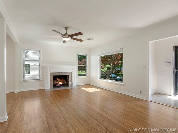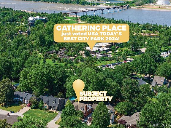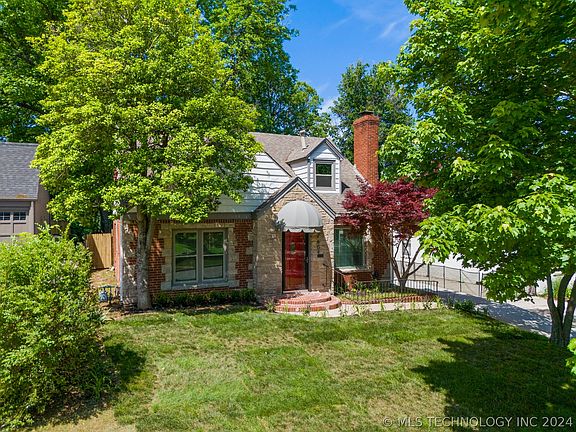 SELLER OFFERING THEIR BUYER $8,000 TOWARD CLOSING COSTS OR BUYING DOWN THE INTEREST RATE! Welcome to this charming, brick & stone bungalow located in the established Sunset Terrace Addition & Maple Ridge neighborhood near "Gathering Place", and the projected 2024 opening of "Zink Lake"! Built in 1939, and expanded years later to offer a more flexible floor plan, this home backing to the Midland Valley Trail features many ways to live comfortably. The main floor features a formal living area with a wood-burning fireplace, seamlessly flowing into the dining & kitchen space with bar seating & granite countertops. The second level offers an open concept primary suite for a more spacious feel with a walk-in closet, double vanity bathroom & living space that also works well as an office area. For those who love to entertain and truly only require two bedrooms, designing the third bedroom into a second living area on the first floor will create great flow! Additionally, the home offers original wood flooring recently refinished in May 2024, new carpet installed in the same month, main level laundry room, and vinyl windows that enhance energy efficiency & allow lots of natural light into the home. The property also features two egresses to the expansive covered patio area overlooking the shaded back lawn, and a gate providing direct access to the nearby trail. The attached one-car garage offers direct home interior access, and there is additional tandem style parking behind the garage! You can reach beautiful parks, downtown Tulsa, & locally owned shops & restaurants within 2.5 miles or less!