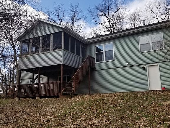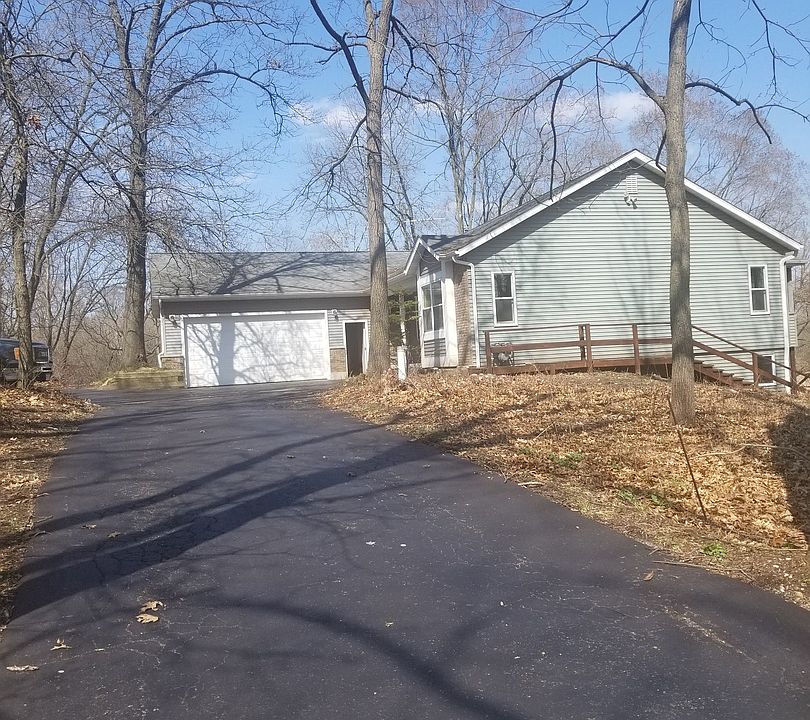 FINALLY FINALLY WE HAVE A SURVEY !t shows the flood plain and there is a place for a small barn on the other side of the pond. Private with mature trees and peaceful views of the pond. Hillside ranch with spacious rooms. Lower walkout level has 2 bedrooms, bath and kitchen. Main level has a huge master suite with private bath with tub and separate shower. Dining and great room with doors out to the screen porch. Great large garage Great high school Prairie Ridge There is a duck house and a chicken coop and now have paths to them near the back. Best part is that they have electricity to them to keep out the wild animals!