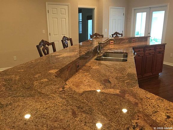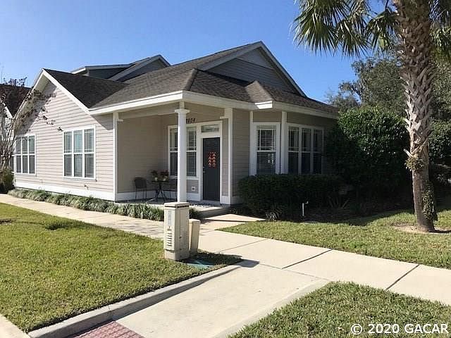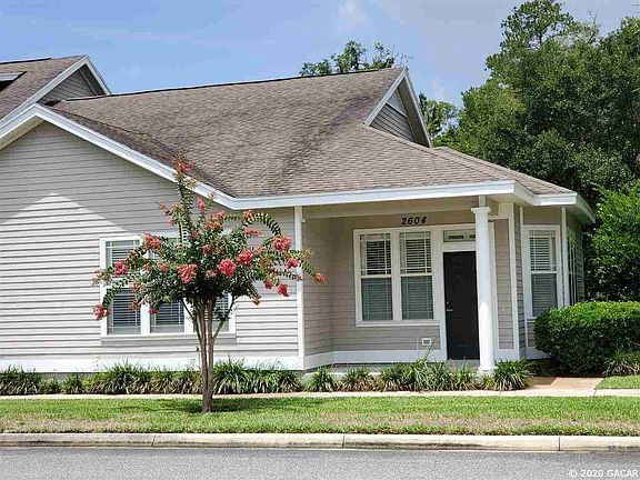 Upgrades galore in this charming home in the Marketplace Square area of Haile Plantation.Built as the model home for the development, it offers hardwood floors throughout, plantation shutters in living areas, expansive gourmet kitchen with wine rack, granite countertops and all stainless steel appliances. It is wired for surround sound. The fireplace in the living room has wiring over it for your TV. This home has a real bonus out back where the landscaped lanai features a small pond with water falling over stones. This area has a covered walkway to the two-car garage. No detail is spared to give you all you need for the comforts of home.