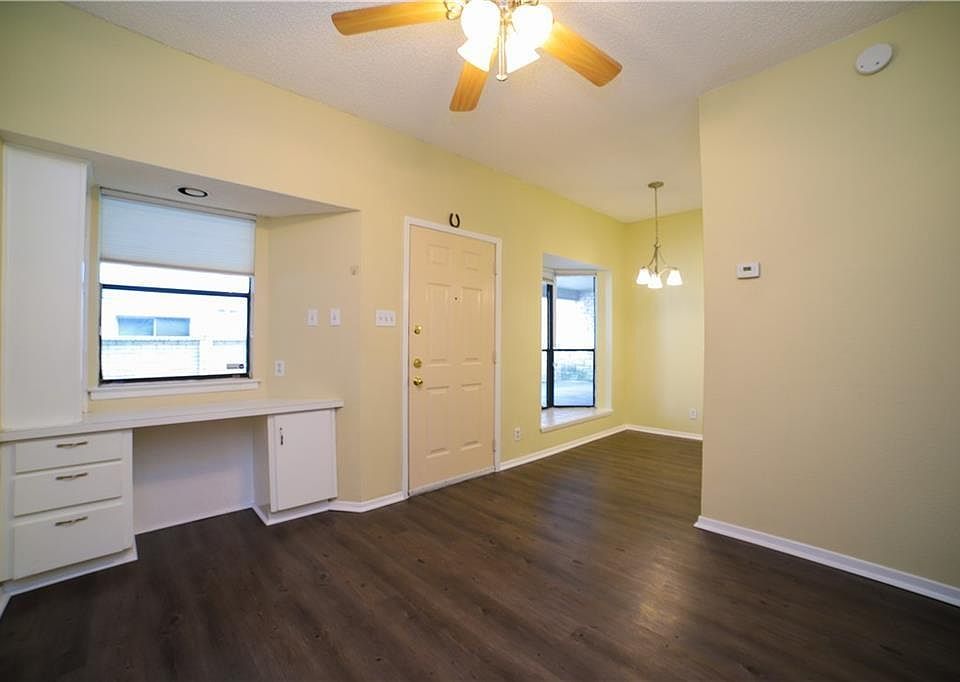 This West Campus 1-bedroom apartment, located at 26th and Salado, offers a spacious living room with built-in shelving and a dining area highlighted by a large bay window. The kitchen comes fully equipped with all appliances. The generously sized bedroom features a ample closet space, a private balcony, and an en-suite bathroom. A washer and dryer are included, along with one designated parking space.