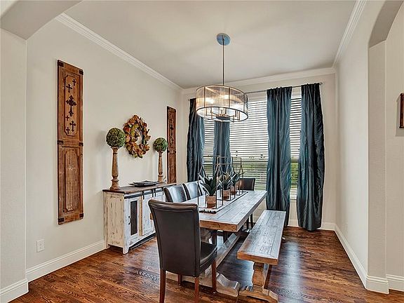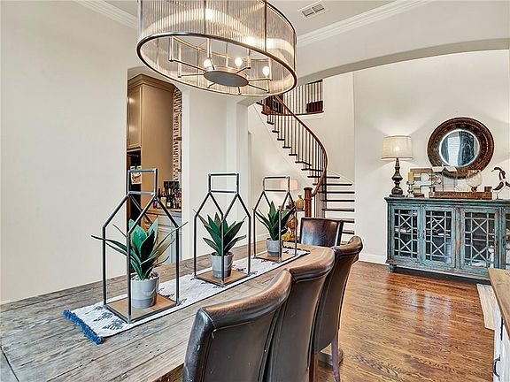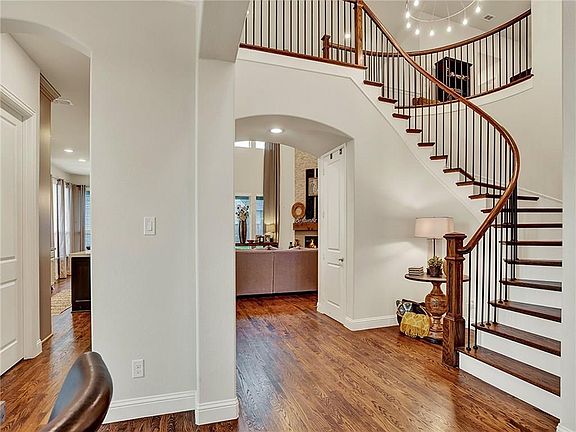 Amazing custom home in best master planned community in Dallas area: Mustang Lakes! Open & bright interior welcomes you with real 2.25in Red Oak hardwood floors downstairs including master, Sonos sound system & speakers, custom lighting & more! Gourmet kitchen with quartzite island & quartz counters, gas cooktop, double ovens, ceiling height cabinets. 2 story family has cozy stone gas log fireplace! Spacious master suite is down with bay window & incredible upgraded bath. Guest bedroom is down! Up is game room, media room & 2 additional bedrooms. Extended lot w plenty of room for pool. Community amenities include: 8 lakes & over 60 acres of trails & creek, resort & tot pools, tennis, tanning decks, playground.