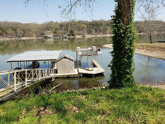 SPACIOUS RUSTIC WATERFRONT HOME ON 150' OF GRADUAL SLOPE WATERFRONT with a gorgeous view. Three bedrooms, two baths, open living/kitchen area, large covered sunporch. So many extras include a large one slip covered dock with swim deck, a pontoon dock, two carports, storage building, and an 18.5'x40.5' garage/workshop with overhead doors on each end. The large fenced yard even includes a beautiful koi pond.